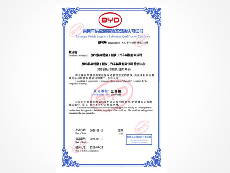 豫北凱斯特隆實(shí)驗(yàn)室拉桿試驗(yàn)獲得比亞迪試驗(yàn)資質(zhì)認(rèn)可